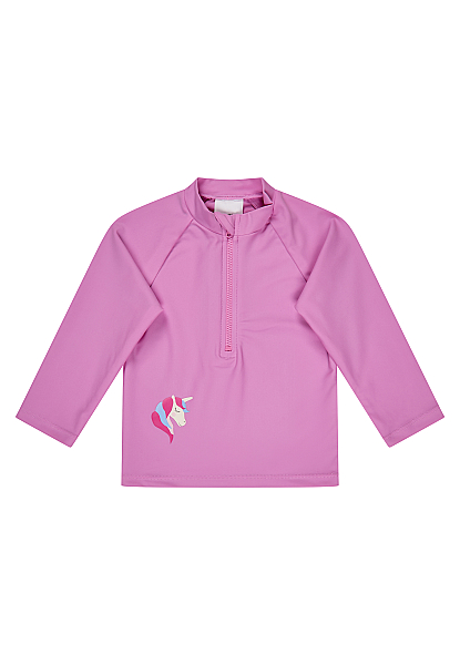 Sterntaler maudymosi marškinėliai ilgomis rankovėmis priekyje turi užtrauktuką, palengvinantį jų apvilkimą ir nuvilkimą. Užtrauktuko viršuje yra apsauga, užtikrinanti, kad vaiko smakriukas netyčia nebus prižnybtas užsegant užtrauktuką. Marškinėlių dizainas yra gaivių spalvų su vienaragio paveikslėliu. Vaikiškų marškinėlių medžiaga greitai džiūsta, tad po maudynių vaikas ir toliau galės žaisti nejausdamas diskomforto. Marškinėliai ilgomis rankovėmis dengia didelę dalį kūnelio, o audinio tankumo filtras suteikia itin svarbią UV 50+ apsaugą nuo pavojingų saulės spindulių jautriai odelei.
